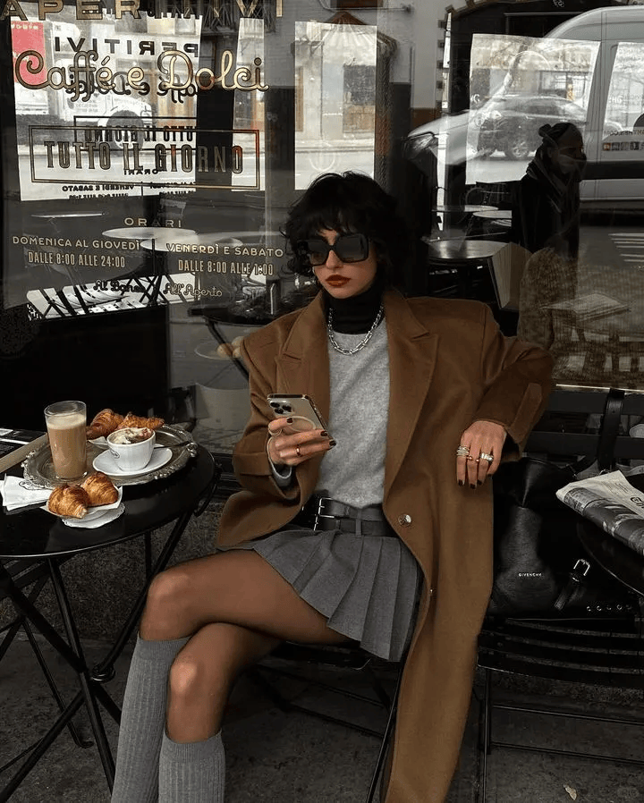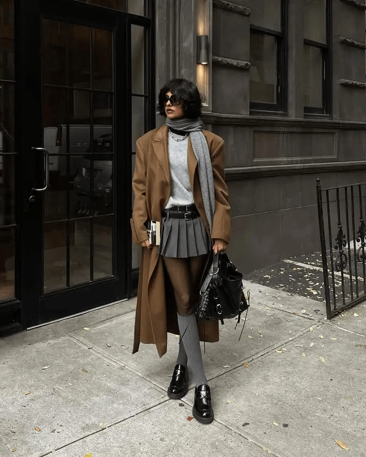 驼色大衣搭配浅灰色系内搭,浅灰色毛衣软糯亲肤,搭配灰色百褶短裙增添灵动俏皮,再配上同色系灰色长袜,上下呼应让造型逻辑更清晰。