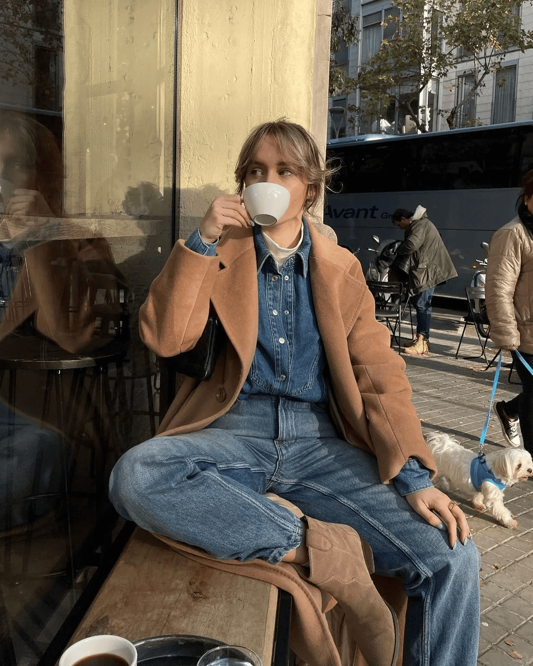 驼色长大衣碰撞全套蓝色牛仔单品,温柔与随性完美融合,牛仔的硬朗质感中和了长大衣的厚重感,让整体造型更显轻盈利落,避免沉闷。