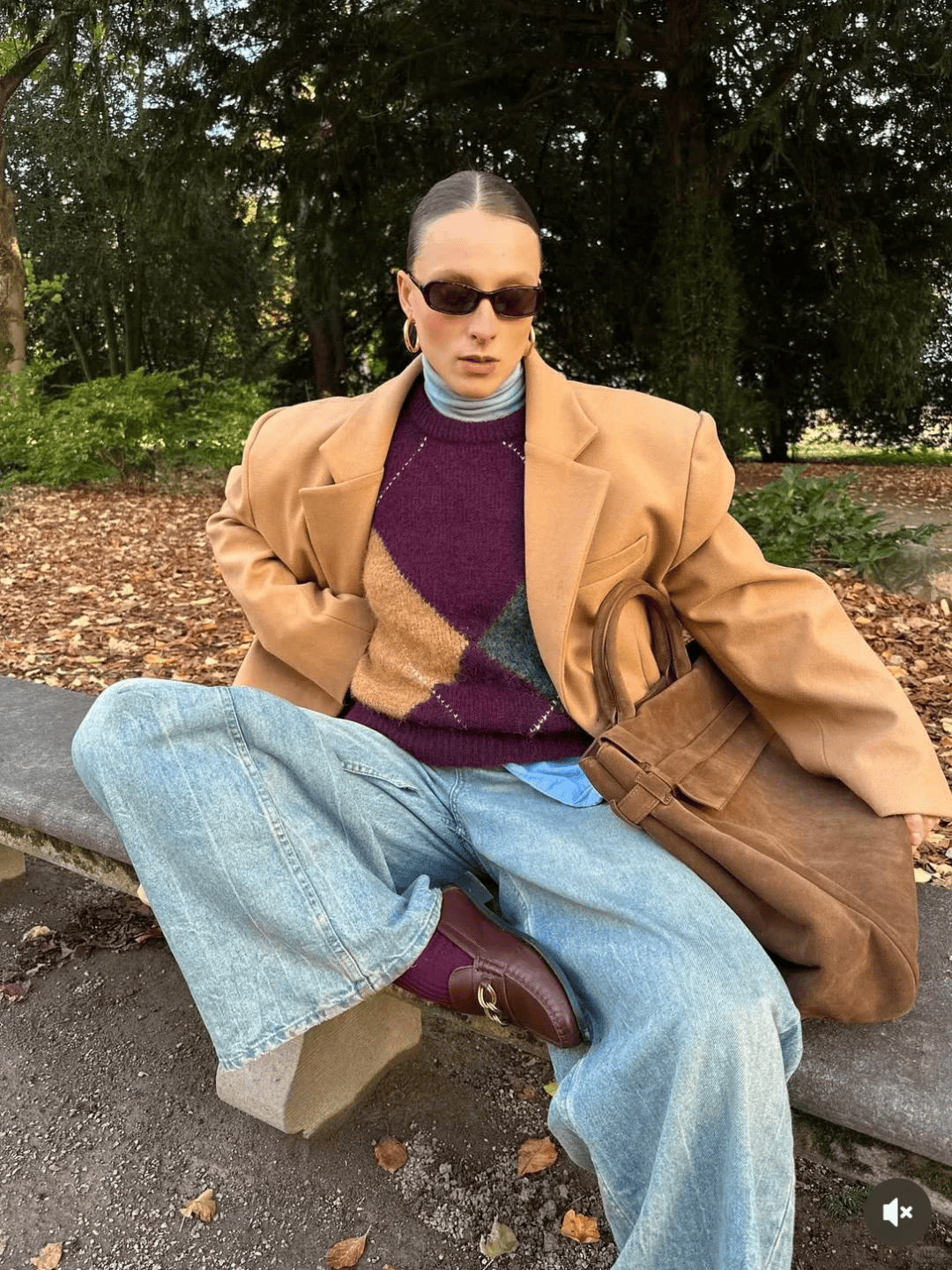 正肩驼色大衣利落显型,内搭酒红色毛衣自带复古暖意,里面叠穿灰色高领衫,既增加穿搭层次感,又能抵御凉意。下装搭配蓝色牛仔阔腿裤,中和了上衣的温润感,添了份随性松弛;脚踩酒红色乐福鞋,配同色系袜子呼应毛衣,色彩首尾呼应,整体造型和谐又有亮点,复古与日常感兼具。