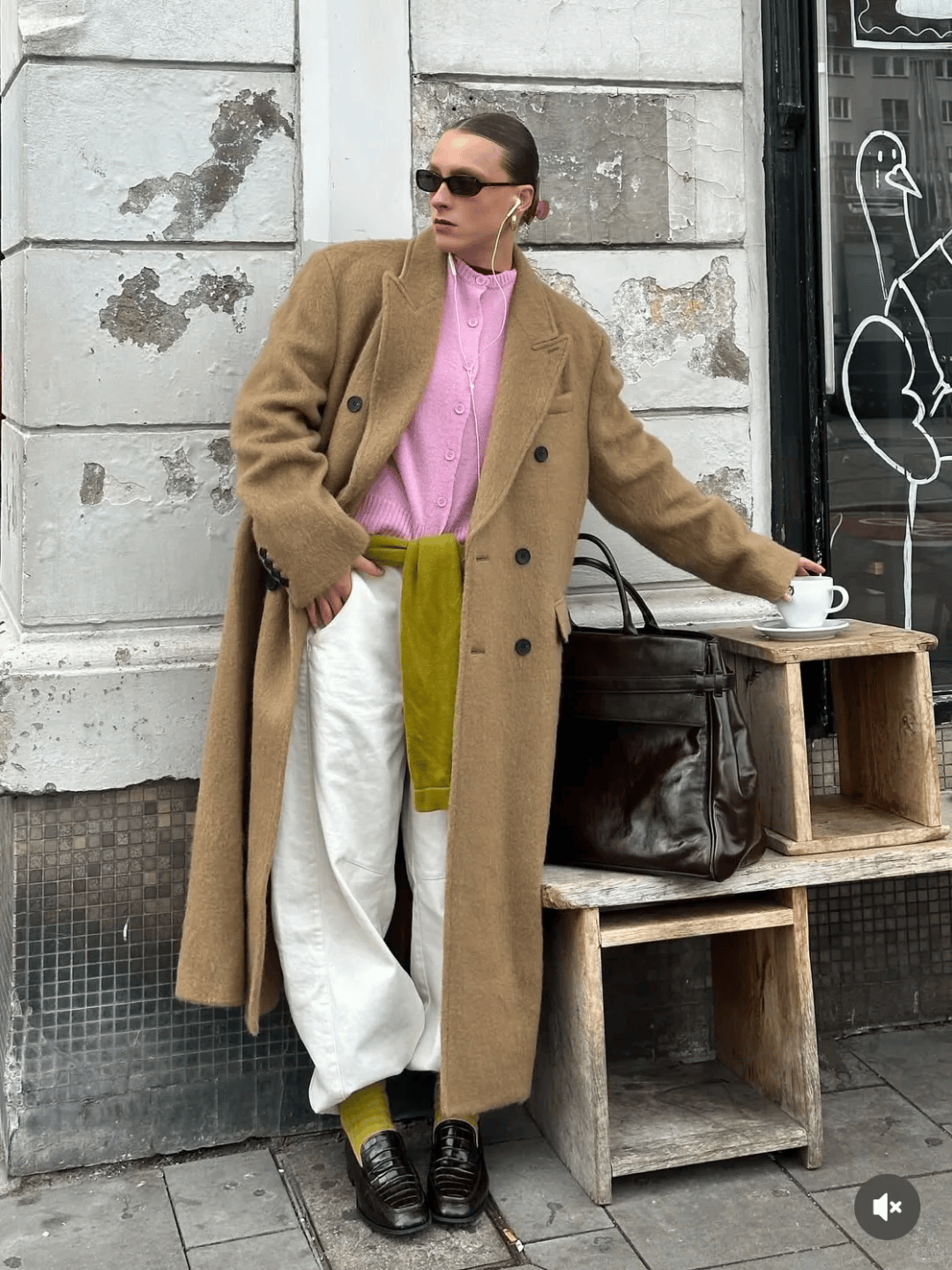 驼色大衣自带温柔滤镜,内搭软糯粉色针织衫,甜而不腻尽显元气。下装搭配白色阔腿裤,清清爽爽拉满利落感,还能衬得整体造型更显轻盈。点睛之笔是绿色袜子与腰间随性系着的绿色针织衫,同色系撞色打破沉闷,既呼应了细节又不显得杂乱,让温柔穿搭多了份灵动巧思。