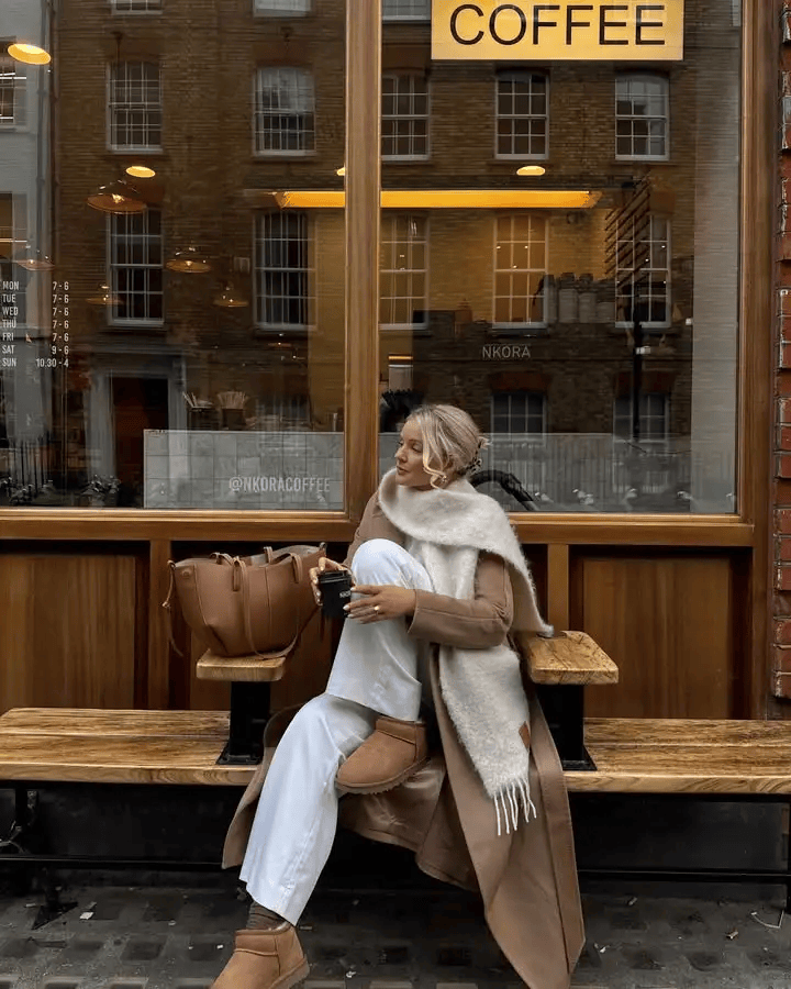 可以戴一顶驼色针织帽,穿一双驼色雪地靴,形成统一基调,衬得驼色大衣愈发温润有质感。