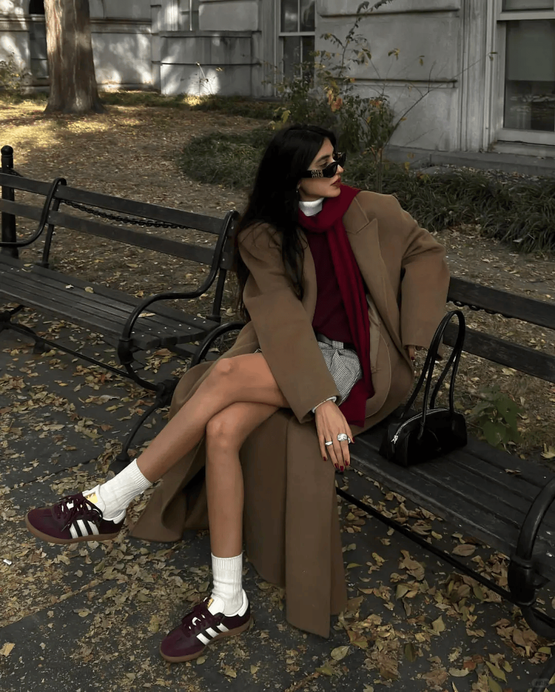 驼色大衣搭配深棕色内搭,自带复古温润的质感,沉稳又显贵,再用一条红色围巾点睛,瞬间打破整体的低调,让造型温暖又有亮点。驼色与深棕色同属大地色系,搭配起来和谐自然,自带高级氛围感,日常穿不突兀。