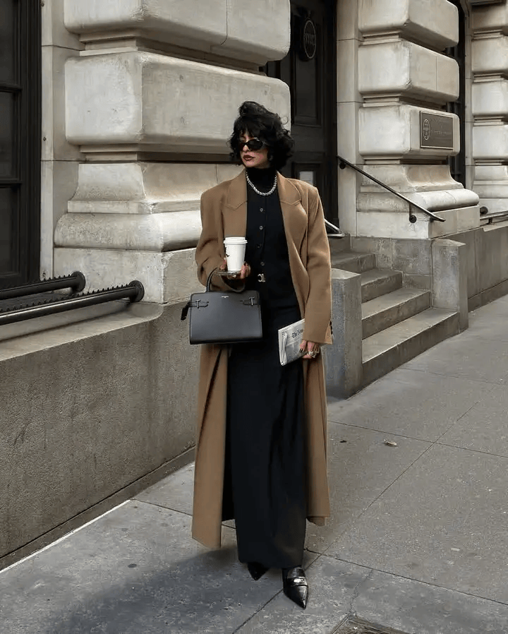 驼色大衣碰撞全黑内搭,一暖一冷的组合高级又利落,全黑内搭压低重心,让驼色大衣成为视觉焦点,简约不单调,自带沉稳大气的格调。尖头皮鞋增添利落感,阔腿裤中和了皮鞋的正式感。