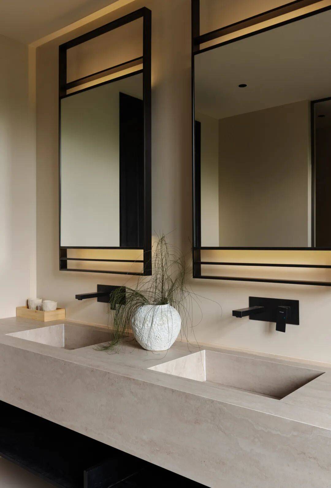 - 采光创新:墙面开设三个圆形玻璃洞,将自然光引入卫生间,并形成灵动视觉趣味。