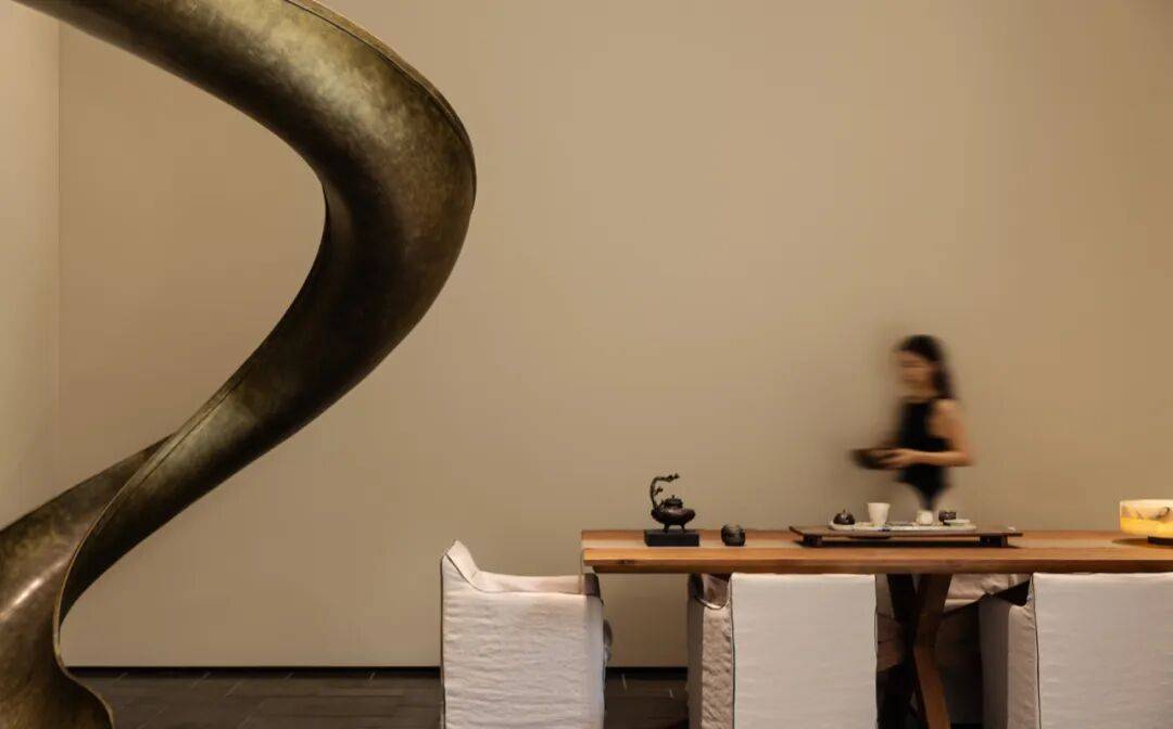 茶室作为静谧的精神角落,采用实木茶桌与素雅席垫,营造出沉静内敛的氛围。在此品茗会友,心境得以沉淀。这与海德格尔强调的“安居之诗”相契合,茶室成为居住者“诗意地接受尺规”的精神场所,让人在繁忙都市中找到内心的安宁。