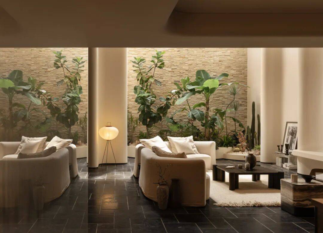 天井与垂直绿化系统:设计引入天井并结合模拟自然光系统,解决了地下空间采光问题。墙面垂直绿化与地面苔藓造景共同构成了室内生态绿洲。绿植不仅净化空气,更将自然生机引入室内,与冷硬的滑梯、墙体形成“柔与刚、生与寂”的微妙平衡。这种“城市山林”的隐逸氛围,呼应了海德格尔对人与自然和谐共处的呼吁,让居住者在都市中也能感受到自然的疗愈力量。