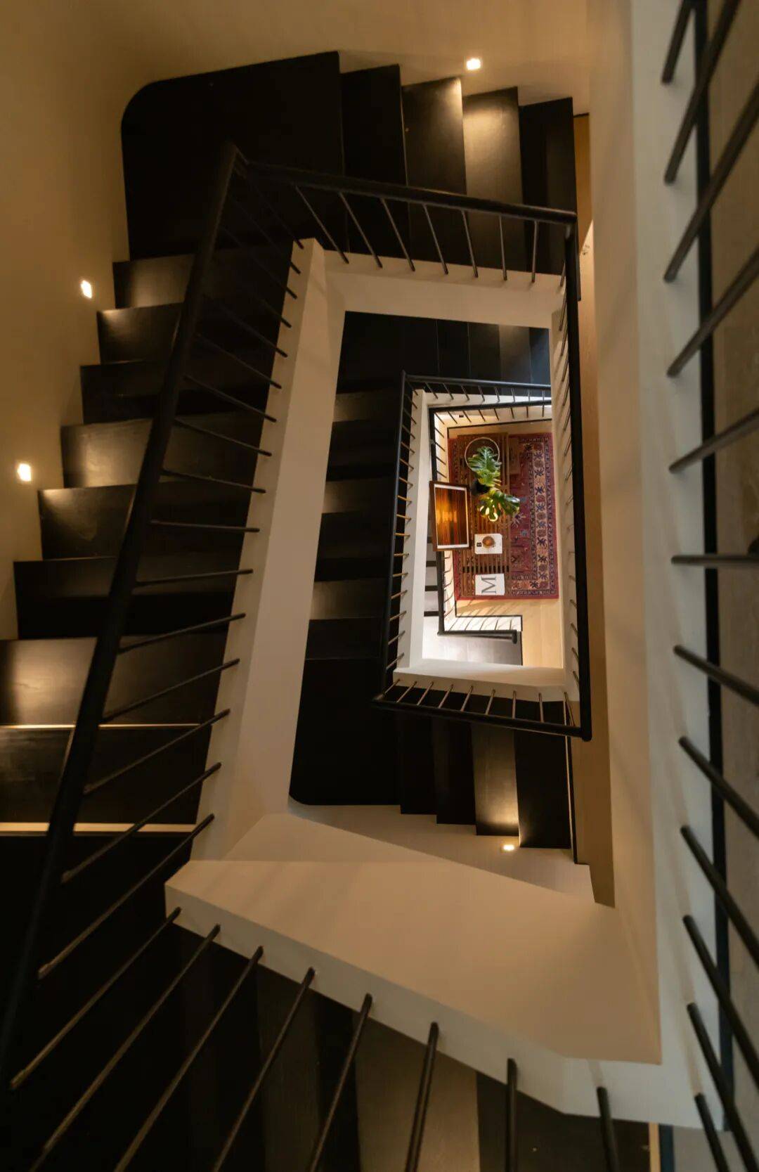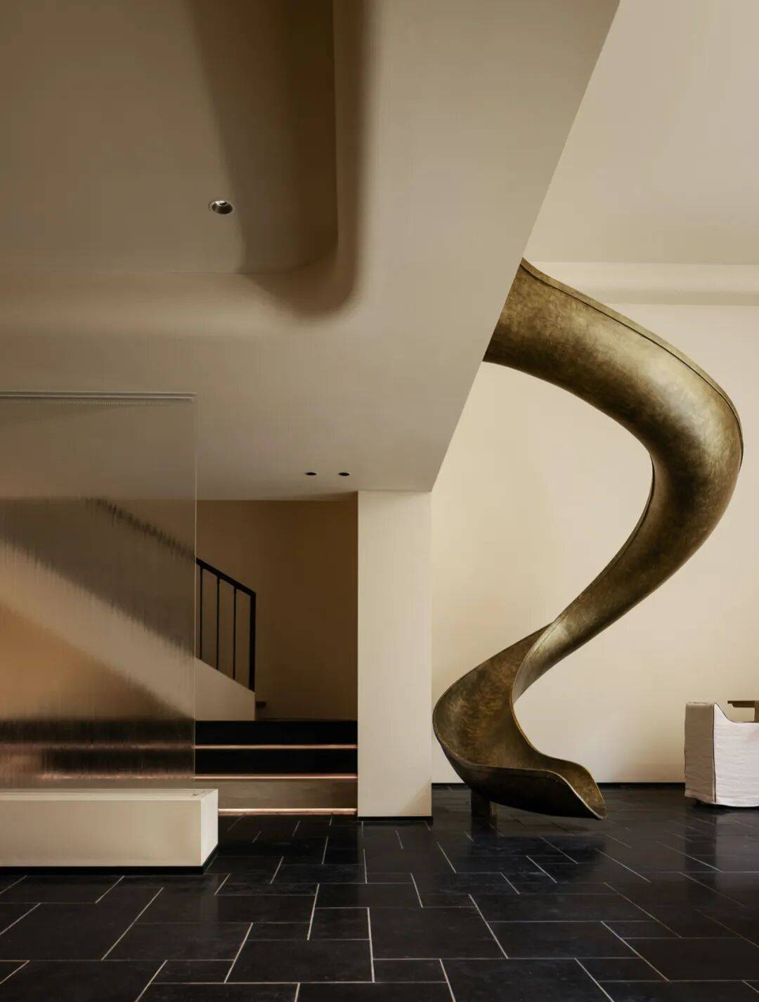 一座极具雕塑感的古铜金属滑梯成为贯穿空间的艺术焦点。其流动的曲线打破了建筑的刚性结构,金属材质在时光打磨下愈发醇厚,为纵向空间连接增添了童真与仪式感。这不仅是功能性的通道,更是空间中的“艺术品”,体现了“诗是真正让我们安居的东西”(海德格尔)这一理念,通过艺术化的设计让居住空间充满诗意。