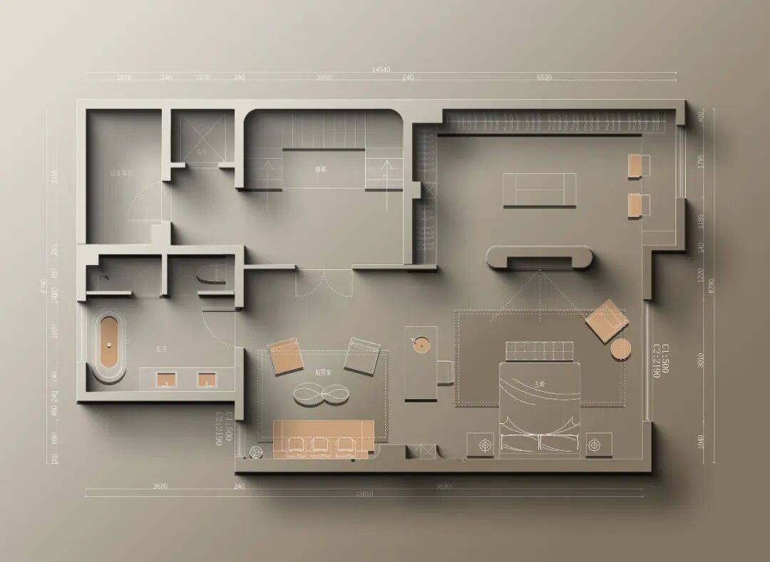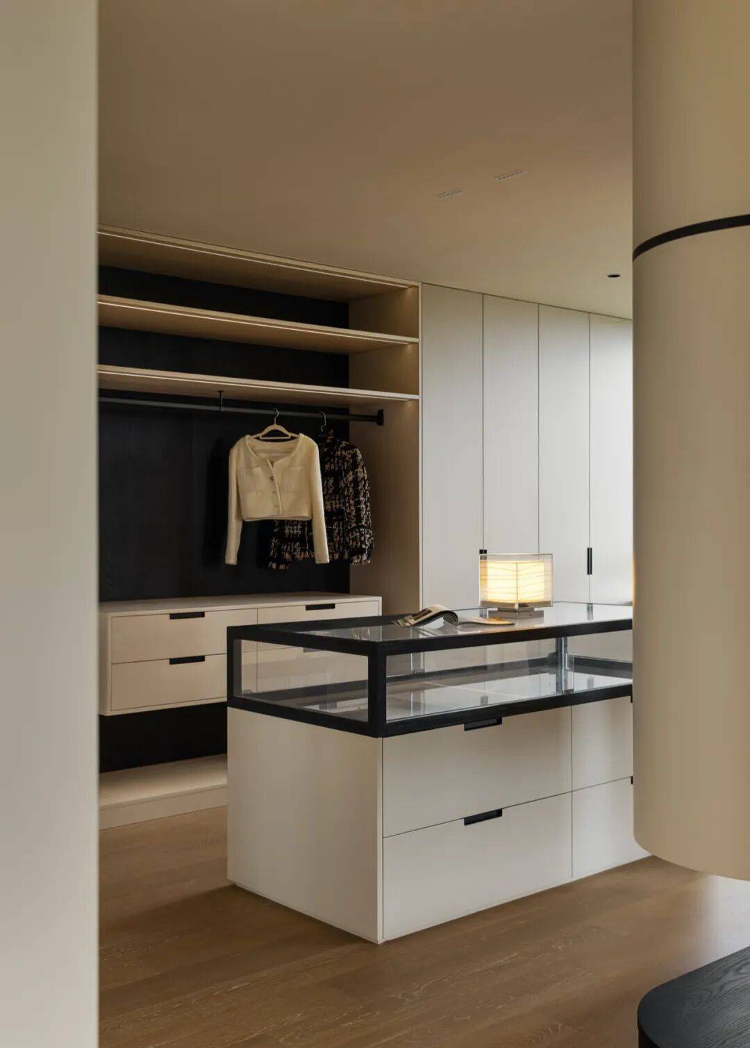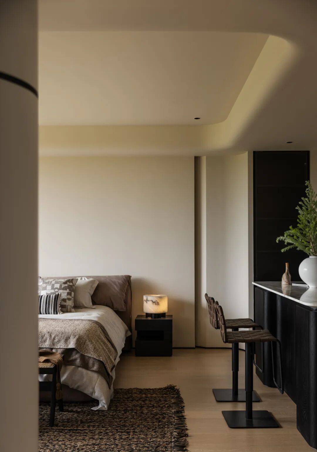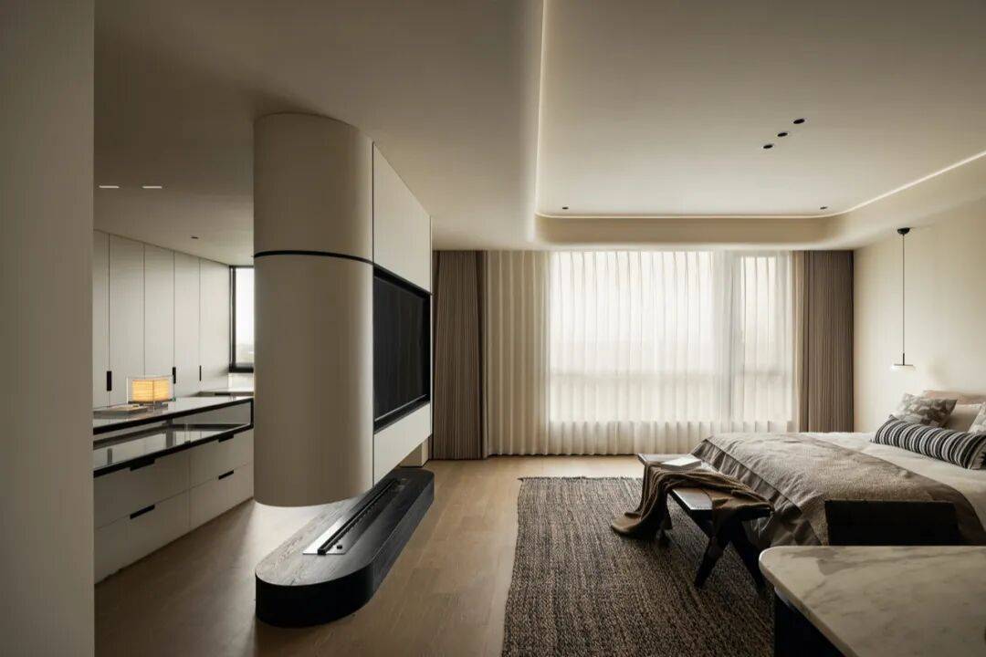 100平方米开放式主卧套房以家具代替隔墙,通过中央岛台和定制柜体划分睡眠区、起居区、衣帽间及卫浴区: