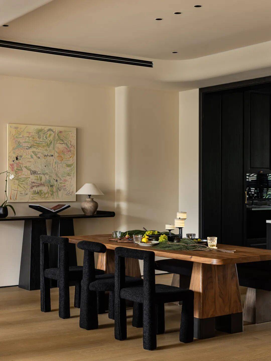 - 色调与材质:米色系基底点缀黑色线条,大量运用原木开放漆材质,展现天然纹理与温暖质感。