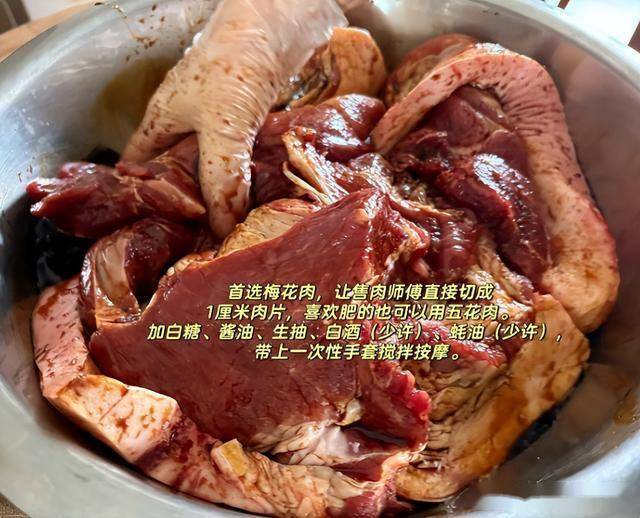 - 将梅花肉用清水冲洗表面血水,用厨房纸巾彻底擦干水分(关键:肉一定要干燥,否则会影响腌制效果)。