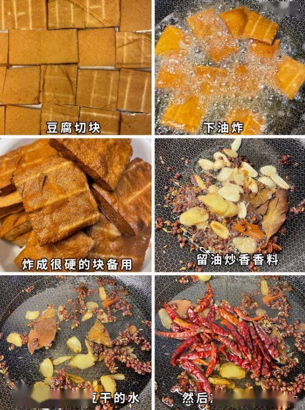 - 倒入焯好水的豆干块,转中火快速翻炒,使豆干均匀裹上香料油。