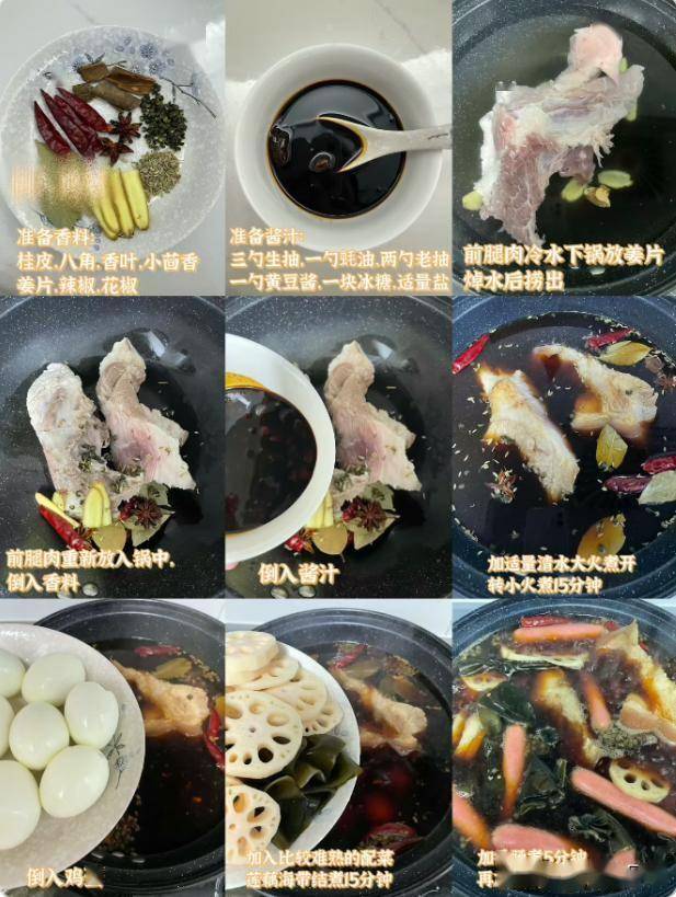- 卤制食材:鸡蛋6-8个、腐竹100g、前腿肉200g、海带结100g、香肠2根、莲藕1节