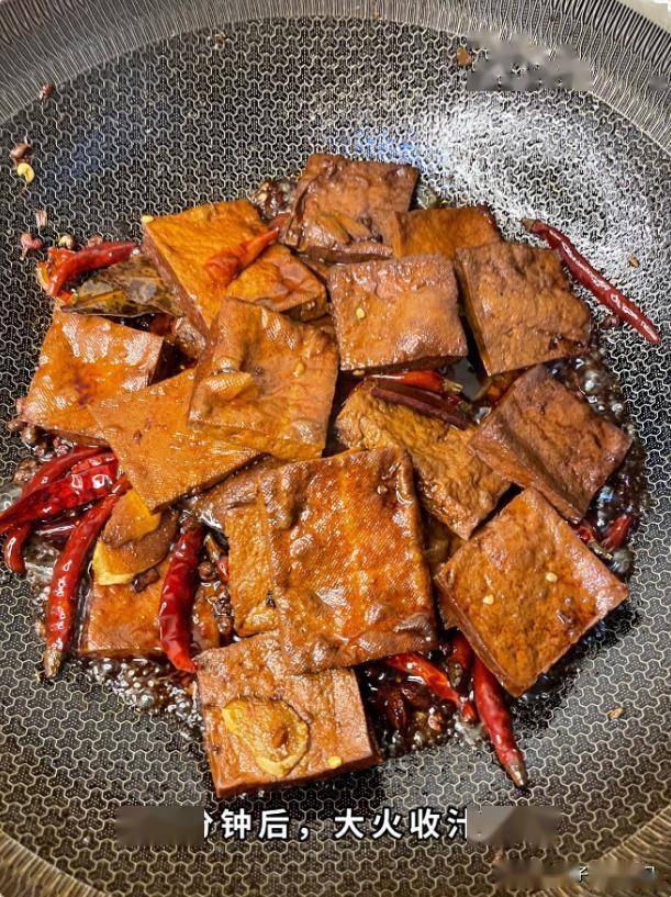 - 开盖后转大火快速翻炒收汁,直至汤汁浓稠并均匀附着在豆干表面即可关火。