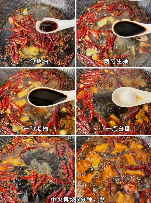 - 加入花椒、八角、小茴香、香叶和干辣椒段,小火煸炒出香味。