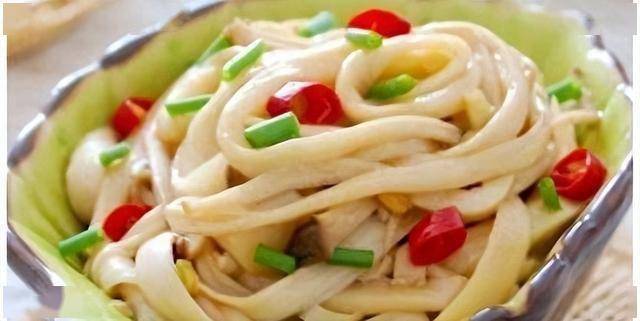 3、蒸熟的杏鲍菇取出稍微放一会,不烫手的时候,将杏鲍菇撕成差不多粗细的小条。