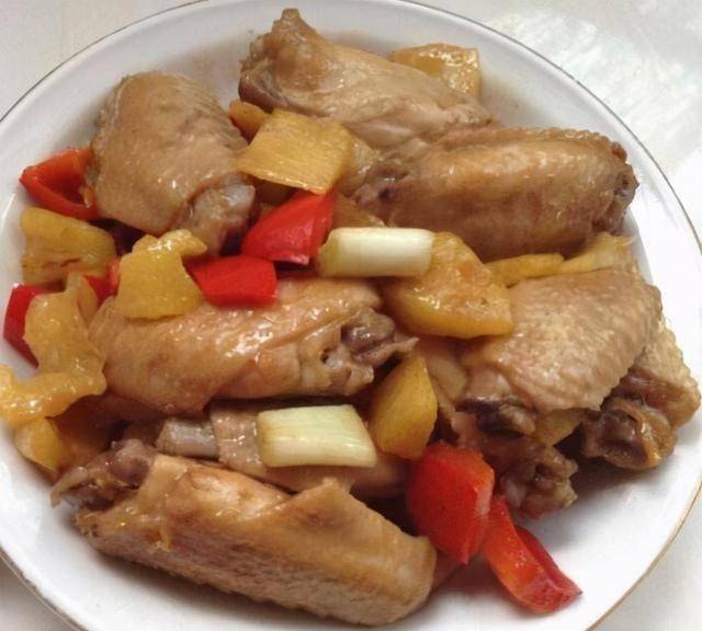 食材:鸡翅250g,菠萝200g,红椒半个,冰糖15g,老抽一小勺,盐1/4小勺