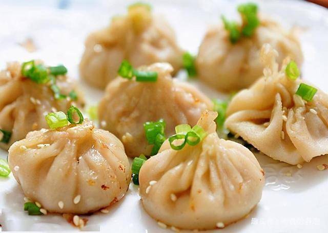 材料:饺子皮50克、猪肉馅150克、植物油2汤勺、料酒1汤勺、清水3汤勺、食盐1/2汤勺、细香葱1小把、白芝麻少许。