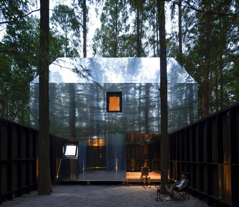 位于森林尽头的银色时光机,像被神秘人轻置于此,闪闪发光,如同机器猫的任意门,让人好奇进入房子后会去往何处。室内空间也充满了奇幻色彩,激发人们的好奇心和探索欲。