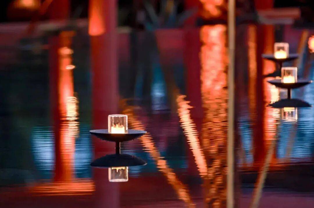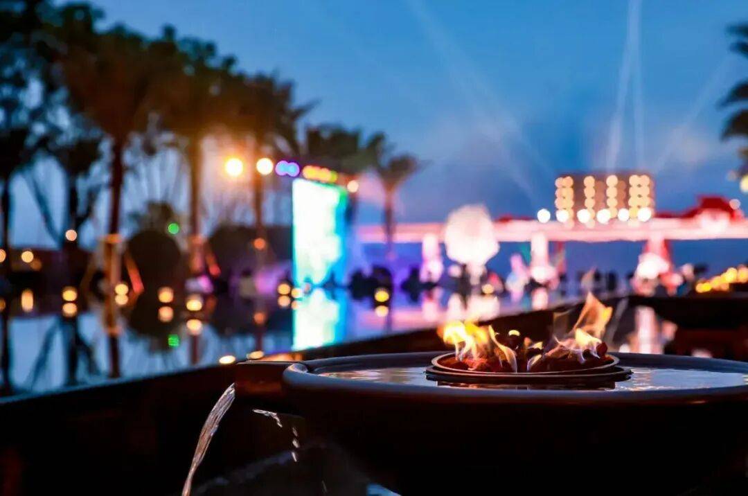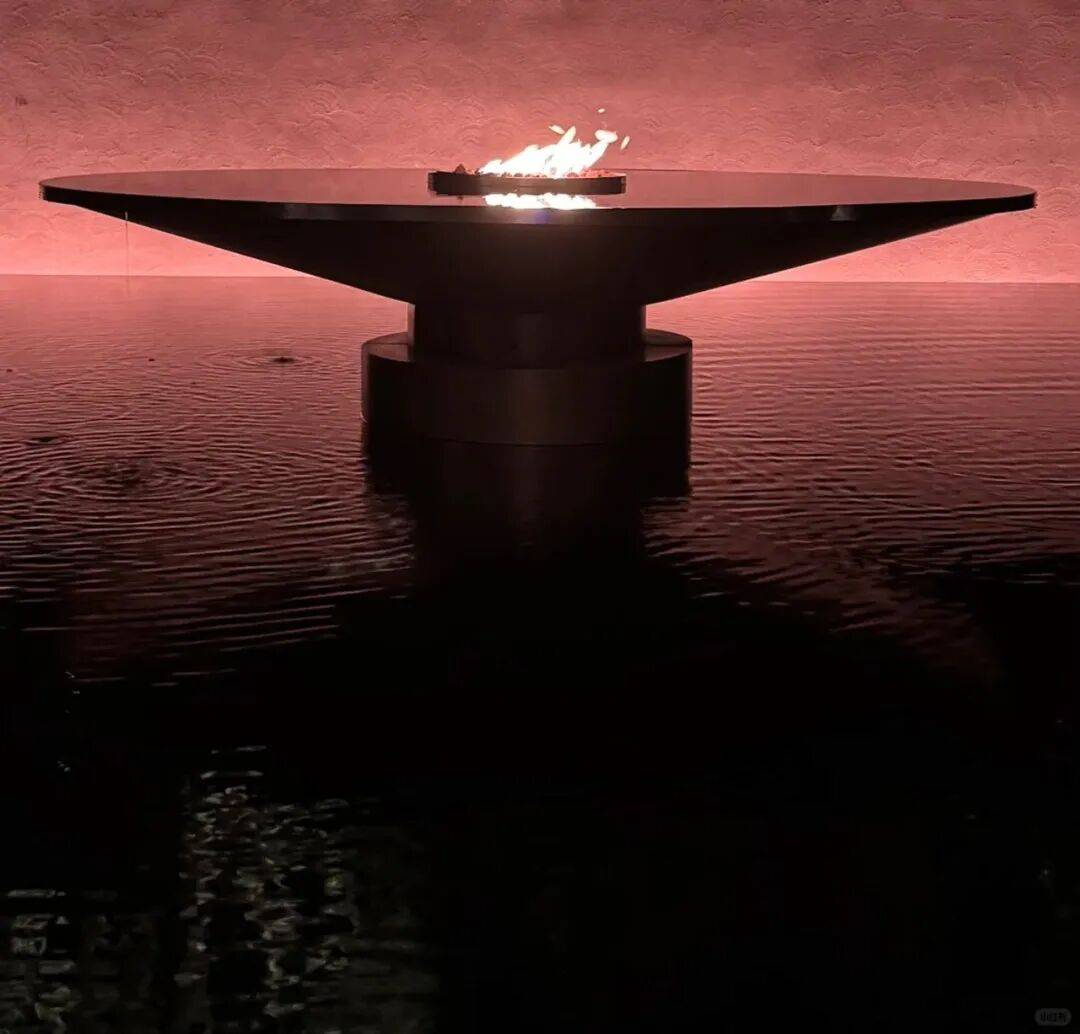 端景连廊,无数小灯编织成灯塔意象,既是视觉的焦点,也是精神的象征。每日定时点亮,如同湖畔的守望者,讲述着光与时间的故事。中庭水面上,3米高的火柱与两侧序列排列的火盆共同构成每日的点火仪式——火焰跃动、灯光渐明,一场原始与现代交融的典礼,唤醒人们对自然力量的敬畏与共鸣。