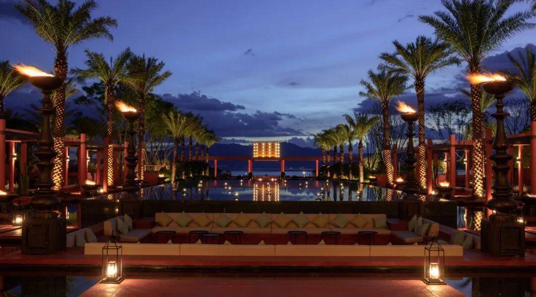 端景连廊是酒店的一大亮点,无数小灯编织成灯塔意象,既是视觉的焦点,也是精神的象征。每日定时点亮,它如同湖畔的守望者,静静地讲述着光与时间的故事。在夜晚,灯光闪烁,仿佛是夜空中的繁星,为酒店增添了一份神秘而浪漫的氛围。中庭水面上,3 米高的火柱与两侧序列排列的火盆共同构成每日的点火仪式。当火焰跃动、灯光渐明,一场原始与现代交融的典礼正式上演。这不仅仅是一场视觉的盛宴,更是一次唤醒人们对自然力量敬畏与共鸣的仪式。在火焰的照耀下,人们仿佛能感受到大自然的磅礴力量,心灵也得到了一次净化和升华。