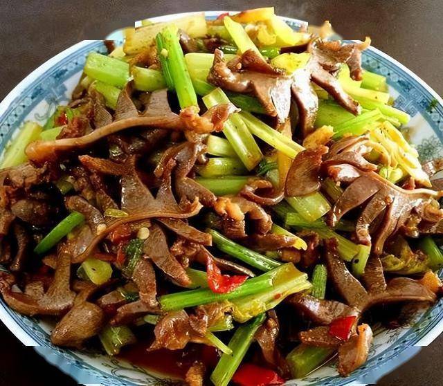 6.放入刚过完油的鸡胗和木耳大火翻炒一分钟。