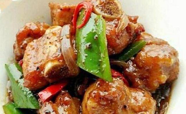 4、重新起锅热油放入洋葱,青红椒炒出香味表面有微微黄了然后下排骨翻炒几下后调小火放入黑椒酱翻炒,放点盐、鸡精调一下味就可以装盘。