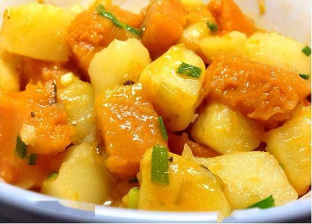 2.锅中放适量油,油开后把南瓜和土豆一起下锅翻炒均匀。