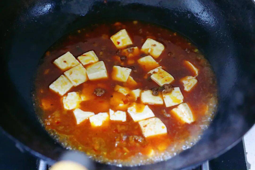 焖煮豆腐:加入适量清水(没过肉末即可),大火煮沸后转中小火,放入焯好的豆腐块,轻轻晃锅让豆腐均匀分布(避免用锅铲大力翻动,防止破碎),盖上锅盖焖煮3-5分钟(让豆腐吸满汤汁)。