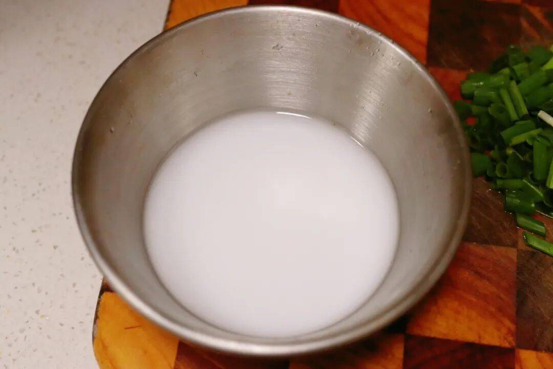 7、这时候调一碗水淀粉,一勺淀粉加小半碗水,搅拌均匀。