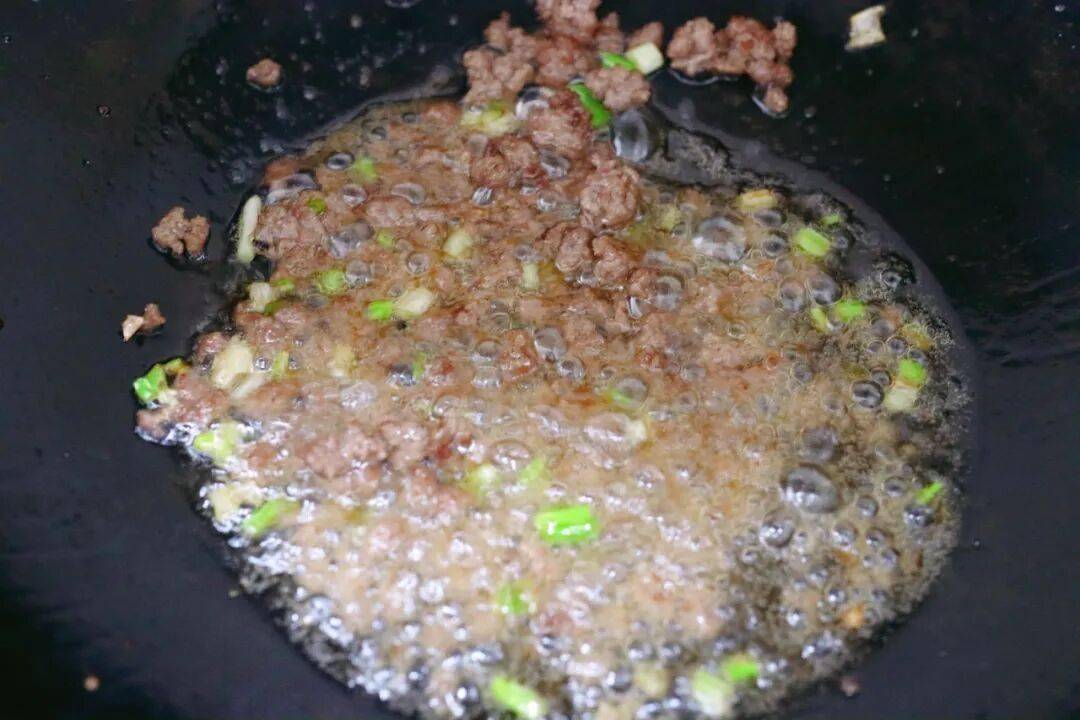 4、锅中油热,放小葱炒炒出香味,再倒入牛肉末翻炒,炒到变色,炒出香味。