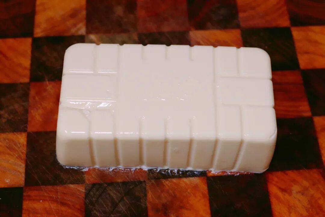 2、一盒内脂豆腐,给大家分享一个取内脂豆腐的小技巧,把盒子底部对角剪两个口子,再轻轻拍下底部,翻过来撕开,再倒扣出来就是完整又漂亮的一块豆腐。