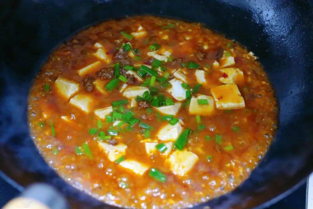 勾芡出锅:淋入水淀粉,大火翻炒至汤汁浓稠(裹住豆腐与肉末),撒上葱花即可装盘。