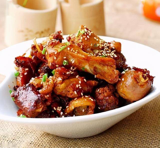 盛出,只要鸡块,其他料丢弃,撒点香葱末和熟芝麻。