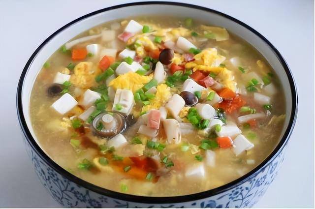 6、接着加入鸡蛋碎、胡萝卜、香肠丁煮2分钟;然后倒入半碗水淀粉,最后撒葱花、加盐煮开即可;