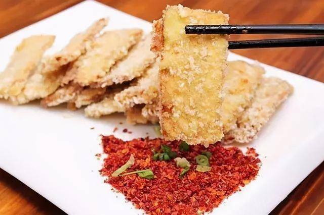 3.净锅上火,放油烧至四五成热时,下茄排生坯并以中小火浸炸至色呈金黄,捞出来装盘后,配麻辣味料一起上桌。