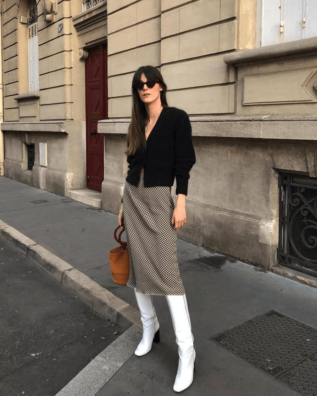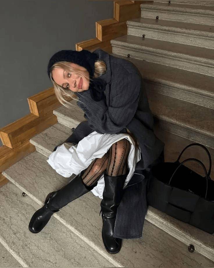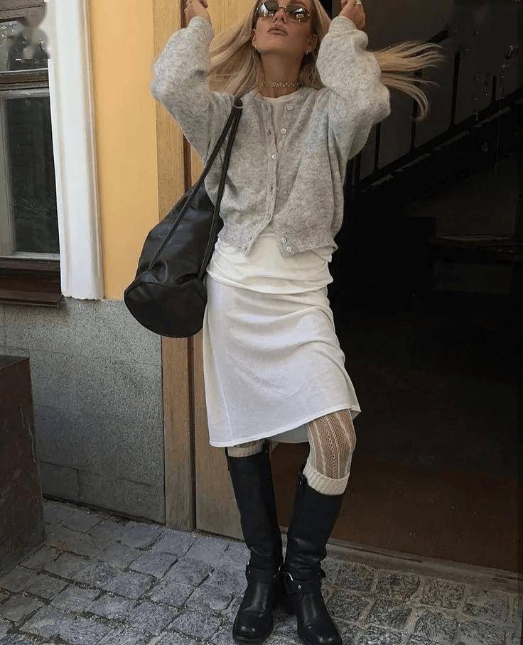 迷笛裙(小腿中部长度)+短靴,显高优雅;