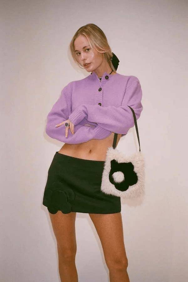 约会派对    短款马海毛开衫+A字短裙+长靴    腰间系带强调腰线