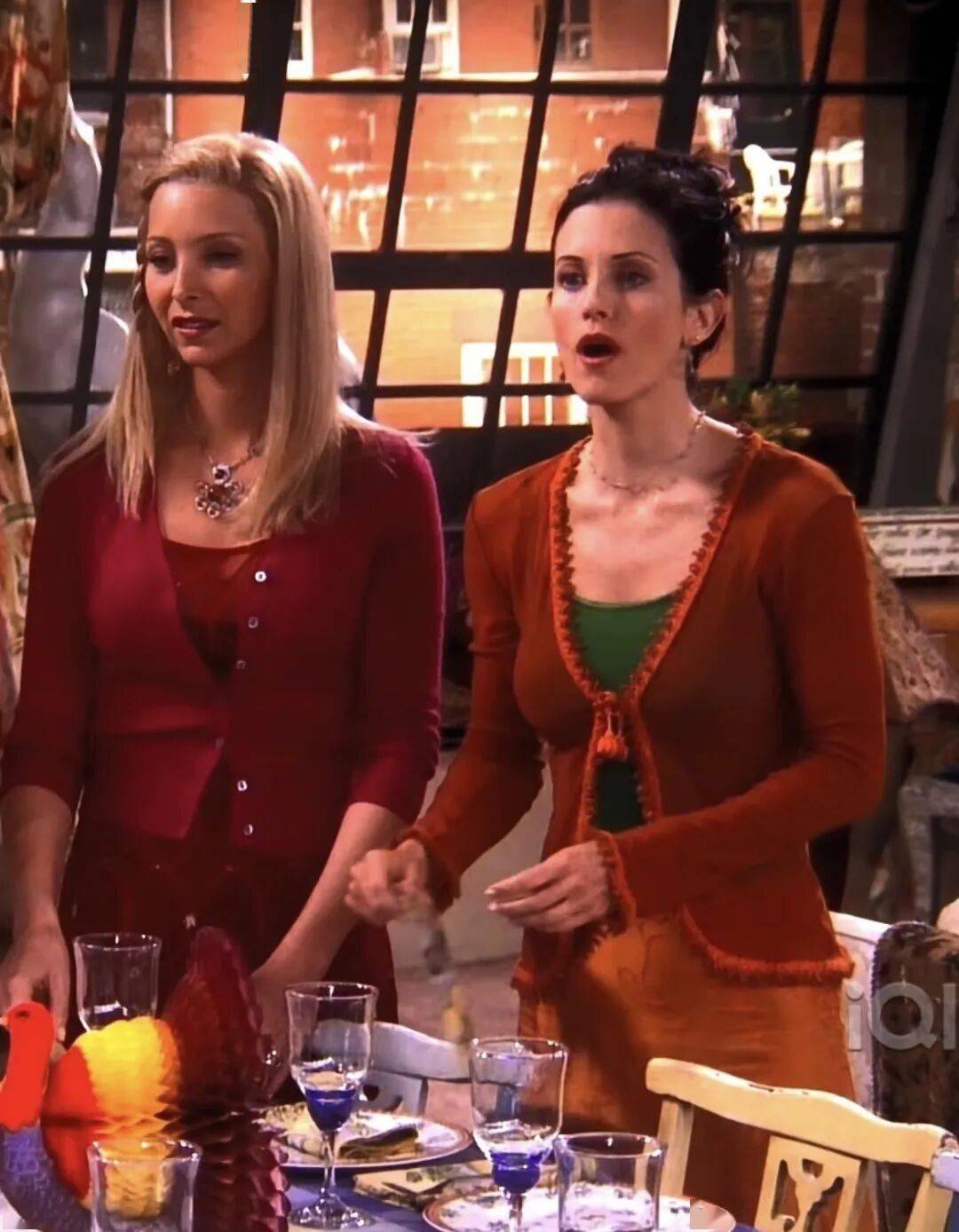 1990年代,带着叛逆气息的时尚偶像们穿着针织开衫搭配短裙、牛仔裤甚至舞台上的吉他,将这件原本“高贵”的单品穿出了流行文化的随意与反叛。回想《老友记》中三位女主角的造型,针织开衫的出现频率高得惊人,从职场到约会,各种款式和花色应有尽有。