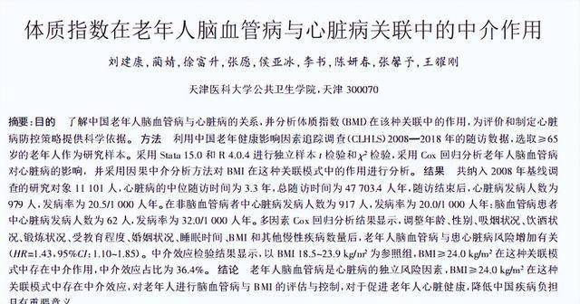 [1]刘建康,蔺婧,徐富升,等.体质指数在老年人脑血管病与心脏病关联中的中介作用[J].中国慢性病预防与控制,2022,30(04):246-250.
