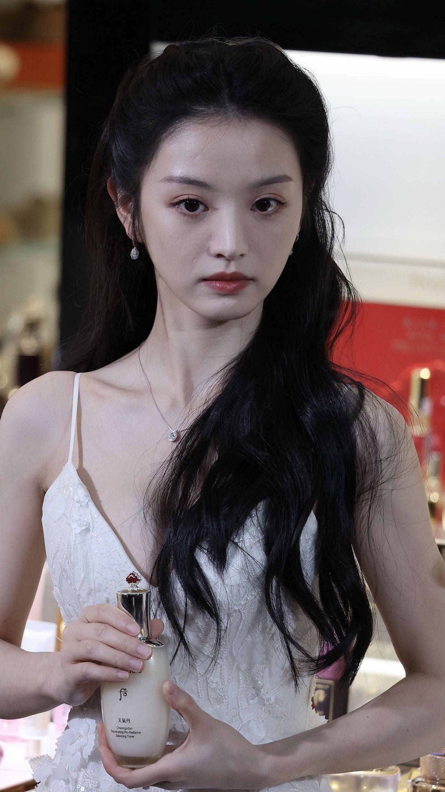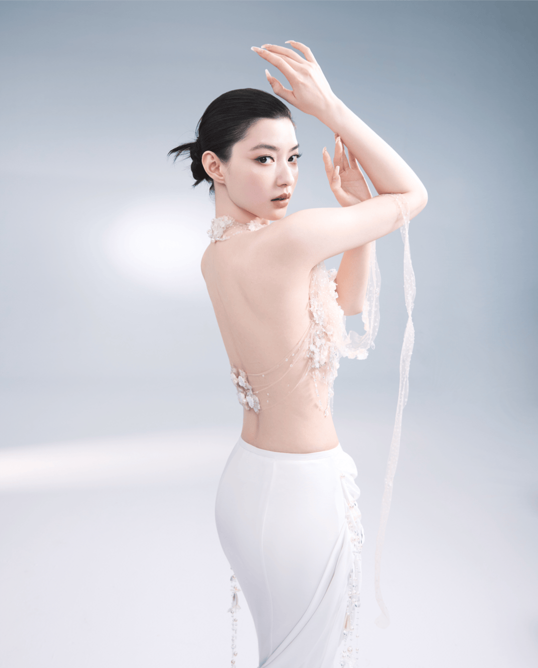 裙子长度及脚踝,既展现了修长腿部线条,又增添了一份优雅与端庄。倪妮搭配柔顺长发和红唇,“红唇映衬康乃馨真娇艳”,这种鲜明的颜色对比让白色更纯,红色更艳,整个人“比花还娇艳,充满青春的气色简直太减龄了”[15]。她的每一个动作、每一个眼神都与裙子完美融合,时而静如画卷,时而动若精灵,将“温柔纯净感拉满”[6]。