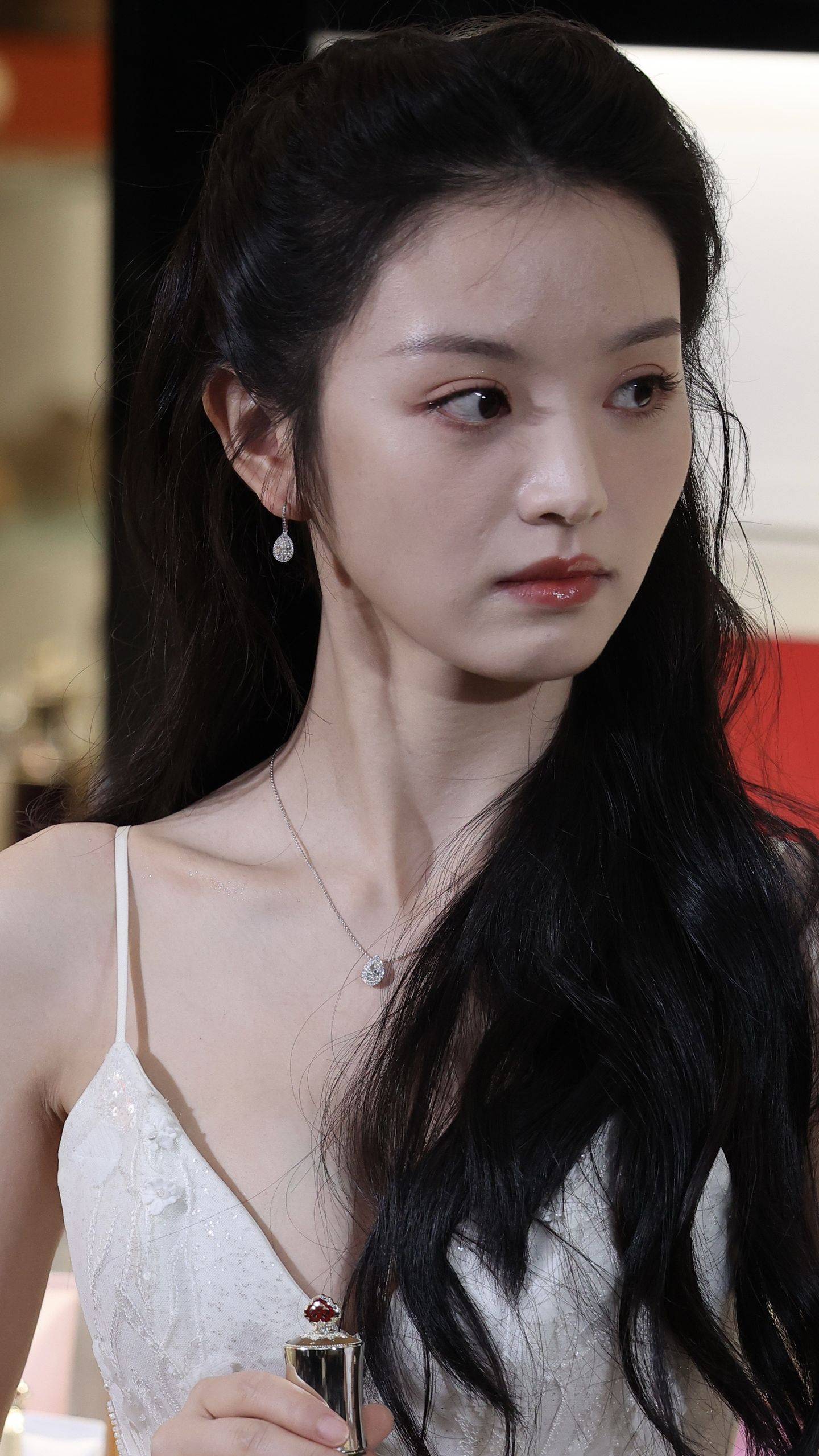 张嘉倪还搭配了一条璀璨的项链和一对精致的耳环,这些珠宝在灯光的照耀下闪闪发光,与裙子上的刺绣花朵相互呼应,进一步提升了整体造型的华丽感。她的头发被精心打理过,柔顺地披在肩上,几缕发丝随意地散落,增添了几分慵懒和随性。妆容也是精致无比,淡淡的眼影和粉嫩的嘴唇,既凸显了她的甜美,又不失优雅气质。
