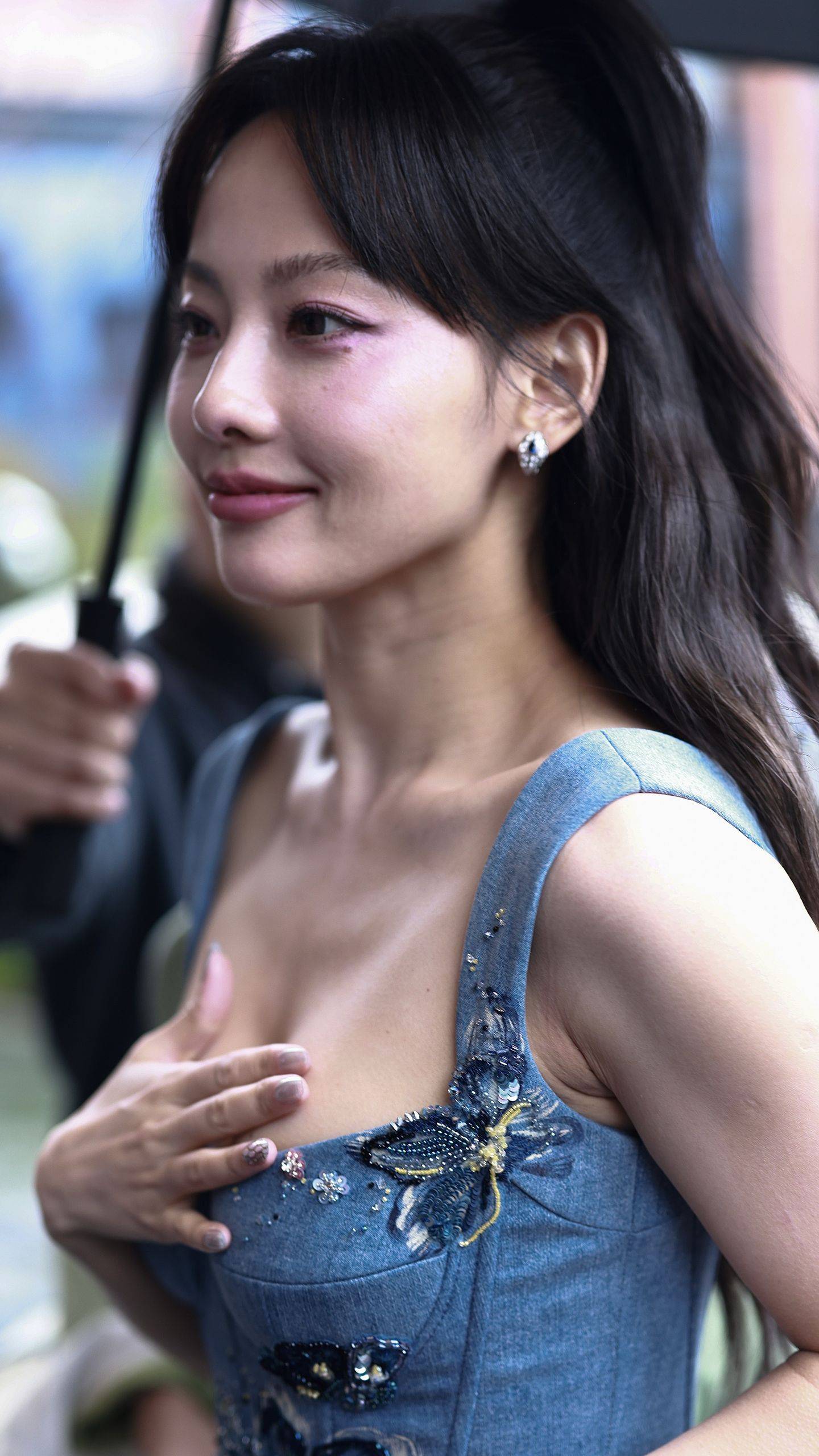 张嘉倪的蓝色吊带牛仔裙造型则展现了另一种风格——将性感与酷感完美融合。