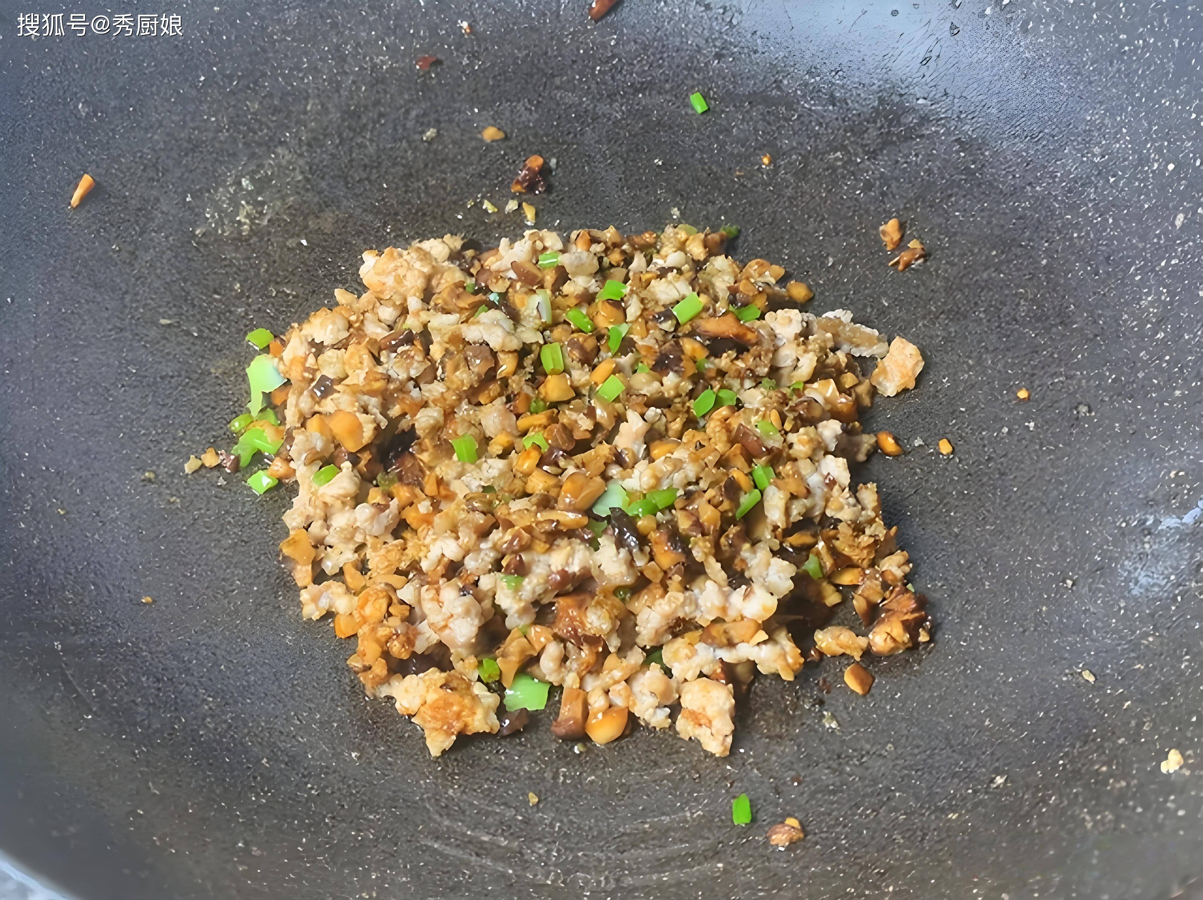 锅里放少许油,油热后先下肉末,煸炒到变色、出香味。接着把胡萝卜丁和香菇丁倒进去,一起翻炒。等胡萝卜变软、香菇的香气完全散发出来,加一勺生抽、一点点白胡椒粉调味,翻炒均匀就可以关火了。盛出来,稍微放凉。