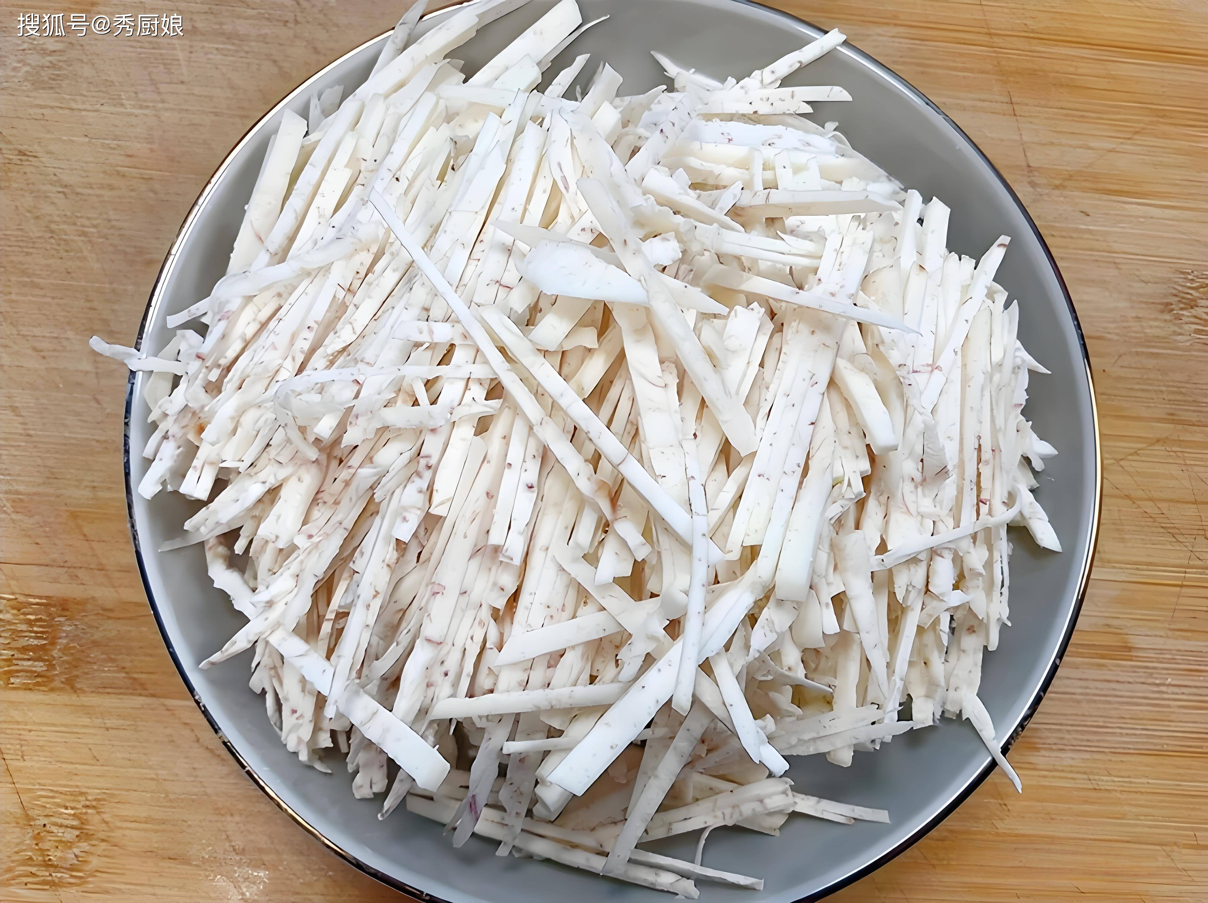 荔浦芋头洗净去皮,用擦丝器擦成细丝。刀工好的朋友也可以直接切,粗细就像土豆丝那样就行。