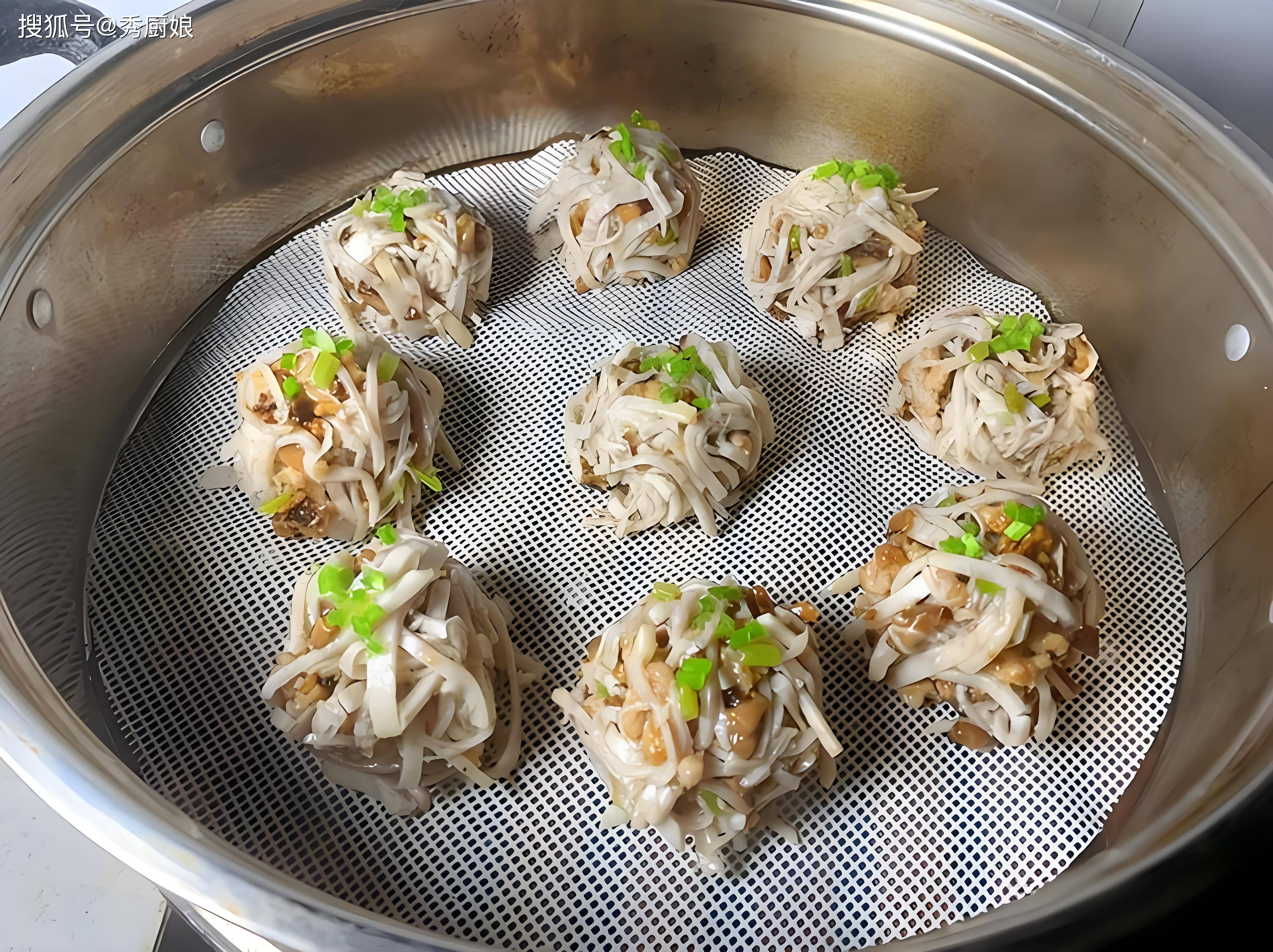 蒸锅里放水烧开。在蒸屉上刷一层薄油,或者铺上洗净的胡萝卜片、白菜叶,防止粘连。把团好的丸子一个个码放进去,中间留点空隙,防止蒸熟后粘在一起。