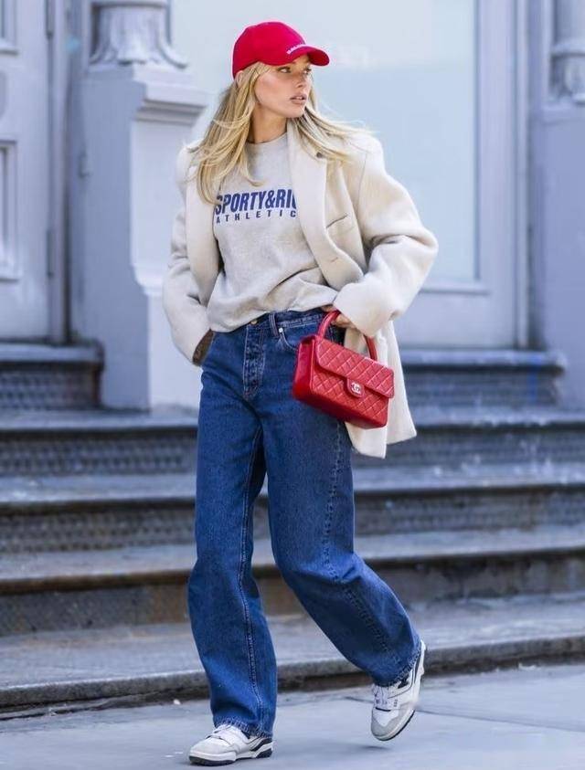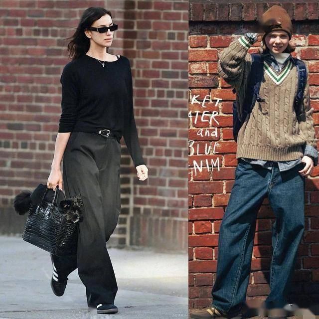 阔腿牛仔裤+针织衫:宽松裤脚盖住部分鞋面,延伸腿部线条,适合小个子;