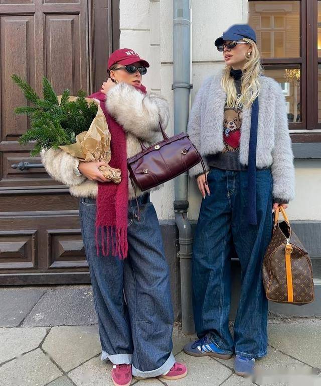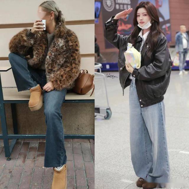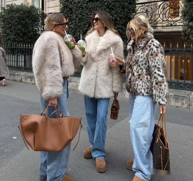 喜欢穿皮草的女生,建议搭配牛仔阔腿裤来穿,降低了皮草的隆重感,显得更轻盈休闲一些,配上勃肯鞋,增加了温暖的味道,同时又让风格显得很可爱。