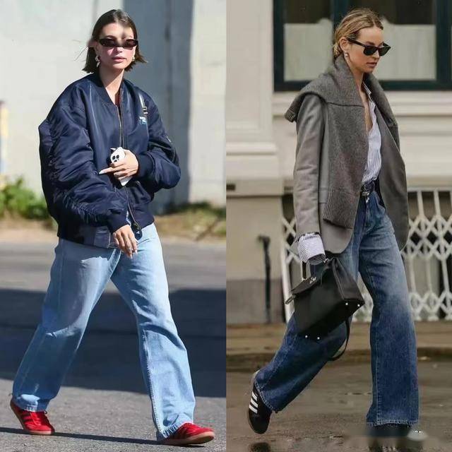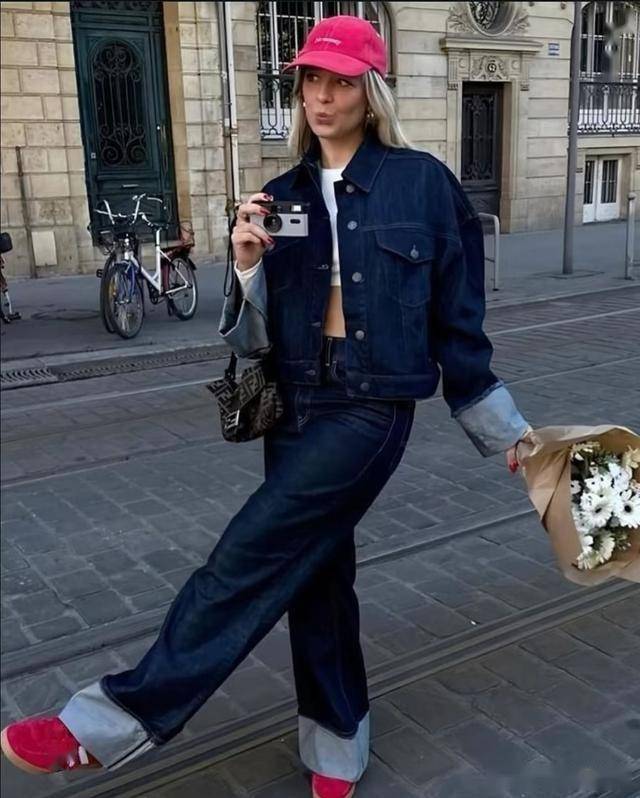 藏蓝色的牛仔衣搭配同色系的牛仔阔腿裤,给人的感觉是硬朗利落的,这时候配一双玫瑰粉色的德训鞋,增加了一些甜美的女人味,让风格更减龄。