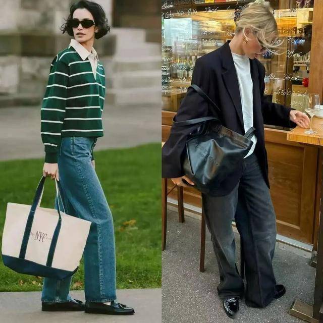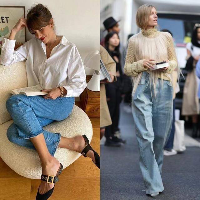 直筒牛仔裤+白衬衫:极简黑白配色,金属扣穆勒鞋点亮细节;