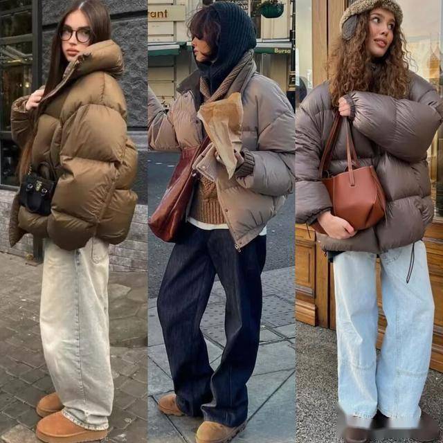 圆润蓬松的面包羽绒服,可以搭配牛仔阔腿裤来穿,增加了慵懒惬意的冬日氛围,这时候配上一双温暖的勃肯鞋,让风格更有氛围与松弛感。